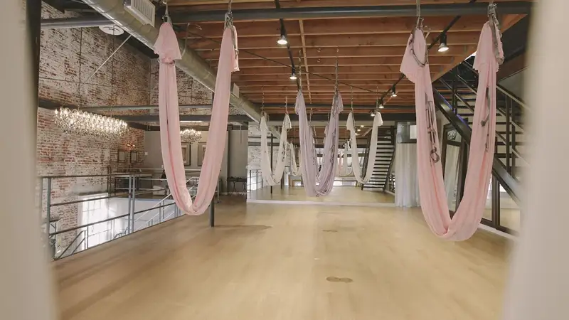 Airy loft space with high ceilings and mirrors, complimentary aerial gear and sanitization, lockers for storage, and rental options for groups; street parking available, but arrive early in Koreatown.