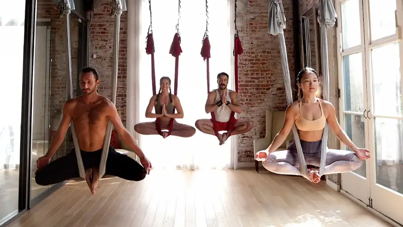 Aerial Yoga for hammock-supported stretches and inversions, Flying Bungee for high-energy low-impact cardio bounces, Pole Dance for strength-building spins, and Sound Bath Yoga for restorative mindfulness with vibrations.